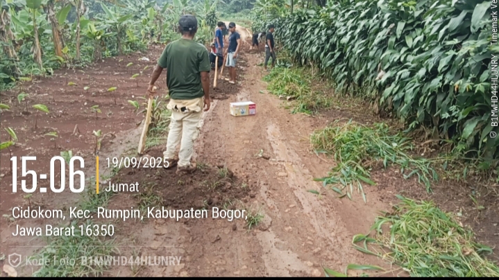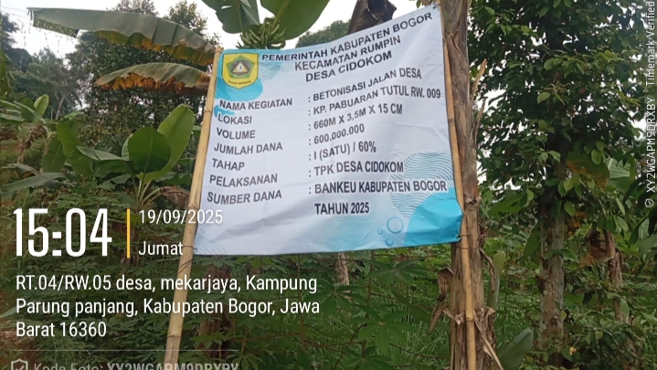 Bogor.swaradesaku.com. Pemerintah Kabupaten Bogor melalui program Bantuan Keuangan Infrastruktur Desa (Bankeu) Tahun Anggaran 2025, mendanai kegiatan betonisasi jalan desa di Desa Cidokom, Kecamatan Rumpin. Pekerjaan tersebut berlokasi di Kampung Pabuarantutul RW 009 dengan panjang 660 meter, lebar 3,5 meter, dan ketebalan 15 cm.(22/09/2025).