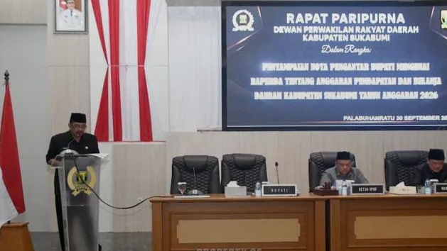 Sukabumi.swaradesaku.com. Bupati Sukabumi H Asep Japar menyampaikan nota pengantar Rancangan Peraturan Daerah (Raperda) tentang Anggaran Pendapatan dan Belanja Daerah (APBD) Kabupaten Sukabumi Tahun Anggaran 2026 dalam Rapat Paripurna DPRD, di Ruang Sidang DPRD Kabupaten Sukabumi, Selasa (30/9/2025).