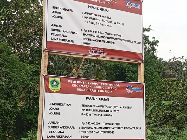 Di Desa Ciaruteun Udik, pembangunan jembatan jalan desa berlokasi di Kampung Gunung Leutik RT 02 RW 05. Jembatan dengan volume P = 7,5 m, T = 6 m, L = 5 m ini dikerjakan oleh Tim Pelaksana Kegiatan (TPK) Desa Ciaruteun Udik dengan nilai anggaran mencapai Rp 664.600.000,- (termasuk pajak). Proyek ini direncanakan rampung dalam waktu 90 hari kerja.