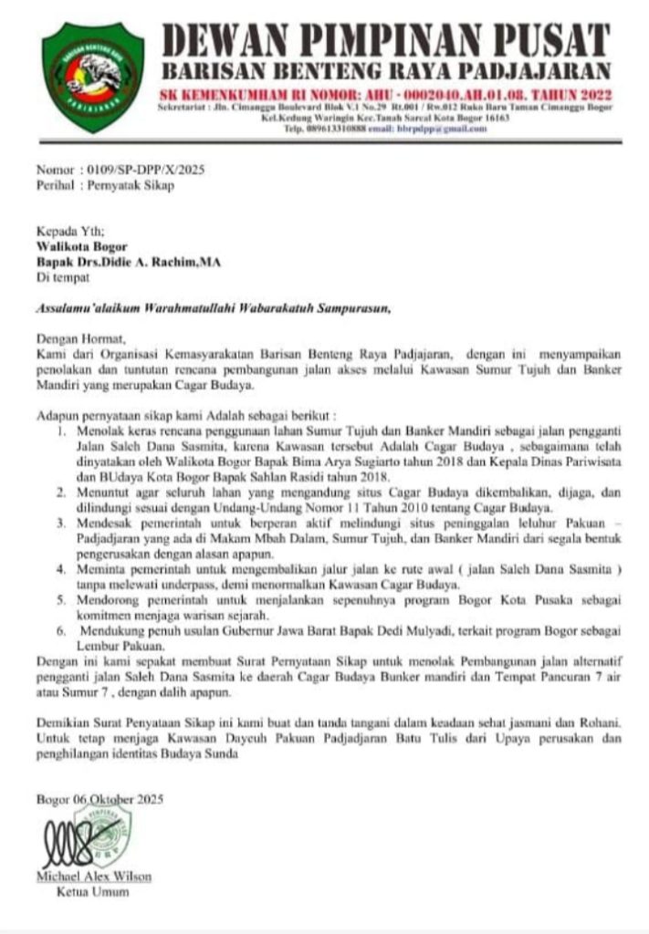 Melalui surat resmi bernomor 0109/SP-DPP/X/2025 yang ditujukan kepada Wali Kota Bogor, Drs. Dedie A. Rachim, M.A., BBRP menilai proyek tersebut berpotensi mengancam keberadaan situs-situs bersejarah peninggalan Kerajaan Pakuan Padjajaran.