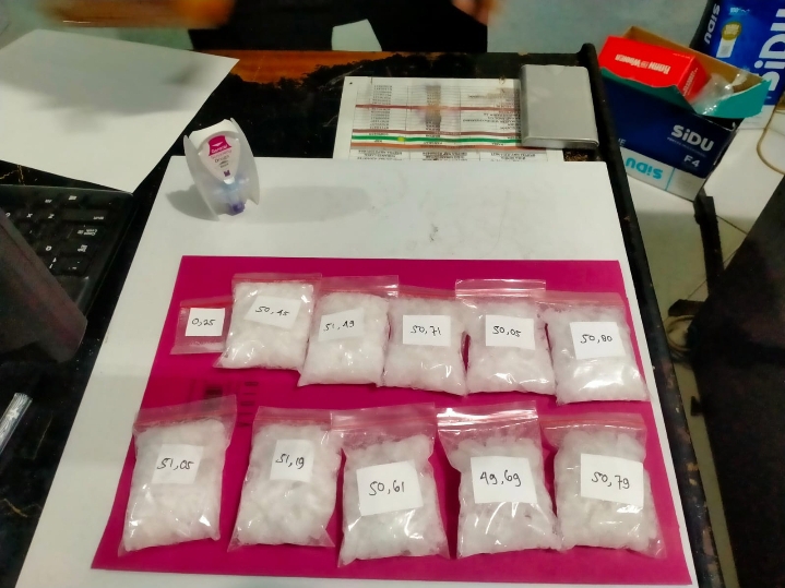 Barang bukti yang berhasil diamankan berupa 10 bungkus plastik klip bening besar berisikan kristal putih yang diduga sabu-sabu dengan berat bruto 506,59 gram, 1 bungkus plastik klip bening kecil berisikan kristal putih yang diduga sabu-sabu dengan berat bruto 0,25 gram, 1 kotak kue merk “SWISS ROLL”, 1 bungkus plastik hitam yang dibalut dengan lakban coklat, 1 unit handphone merk Infinix HOT 50 dan 1 unit mobil Avanza warna hitam dengan nomor polisi KU 1263 AF.