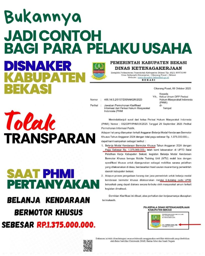 Guna mempertanyakan Transparansi dan Akuntabilitas Dinas Tenaga Kerja Kabupaten Bekasi, PHMI telah mengirimkan surat Permohonan Informasi Publik dengan nomor surat 032/DPP/PHMI/IX/2025, dan telah diterima oleh Pihak Ketenagakerjaan Kabupaten Bekasi pada tanggal 29 September 2025.
