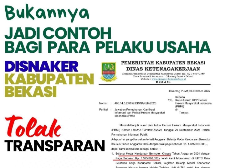 Bukannya Jadi teladan Disnaker Kabupaten Bekasi Tolak Untuk Transparan saat PHMI Soroti Belanja Kendaraan Bermotor Khusus Tahun 2024 sebesar 1,3 Miliar