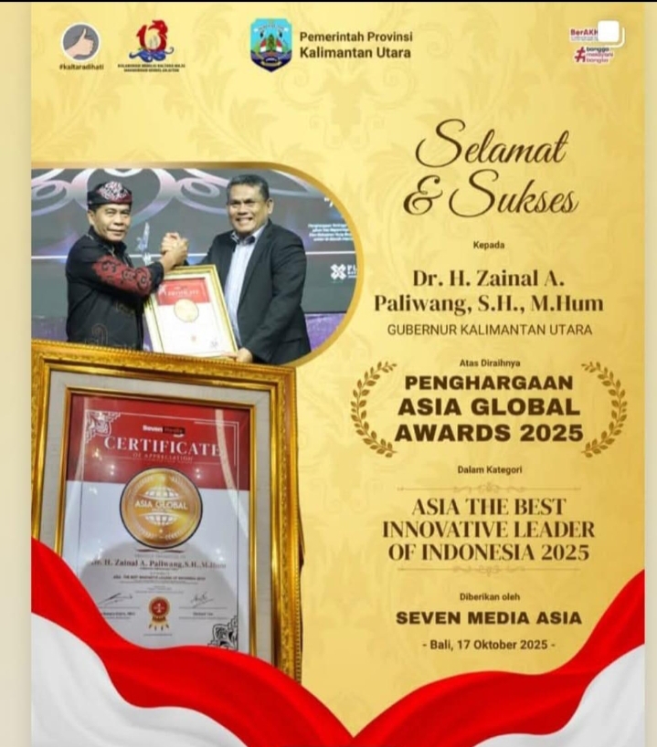 Bali.swaradesaku.com. Prestasi gemilang yang membanggakan seluruh masyarakat Bumi Benuanta lagi-lagi ditorehkan oleh Gubernur Kalimantan Utara (Kaltara), Dr. H. Zainal Paliwang, SH, M.Hum yang kembali mendapatkan penghargaan dari Seven Media Asia dalam ajang spektakuler bertajuk “Asia Global Awards 2025” dalam kategori “Asia The Best Innovative Leader Of Indonesia 2025”.