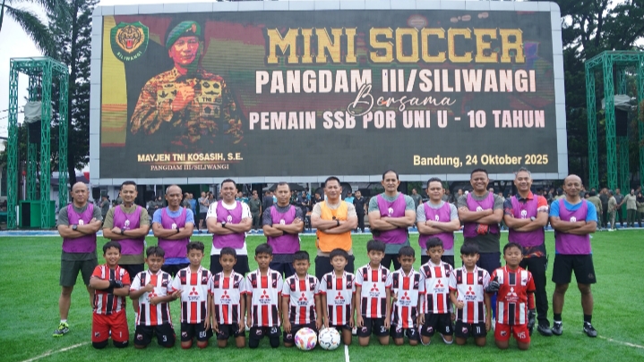 Bandung.swaradesaku.com. Kodam III/Siliwangi menggelar pertandingan mini soccer persahabatan antara Pangdam III/Siliwangi Mayjen TNI Kosasih, S.E., bersama jajaran pejabat Kodam III/Siliwangi melawan tim SSB POR UNI U-10, di Lapangan Prajurit Kodam III/Siliwangi, Jalan Aceh No. 69, Kota Bandung, Jumat (24/10/2025).
