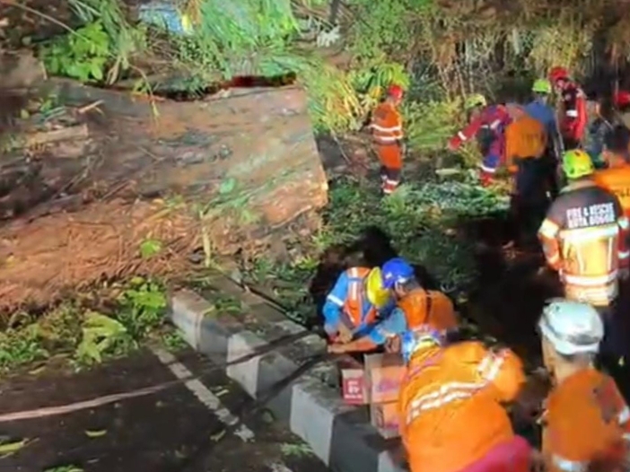 Petugas gabungan dari BPBD Kota Bogor, Dinas Perhubungan, dan Damkar segera datang ke lokasi untuk melakukan proses evakuasi. Mereka bekerja keras menebang batang pohon menggunakan gergaji mesin dan membersihkan ranting-ranting yang berserakan di jalan.