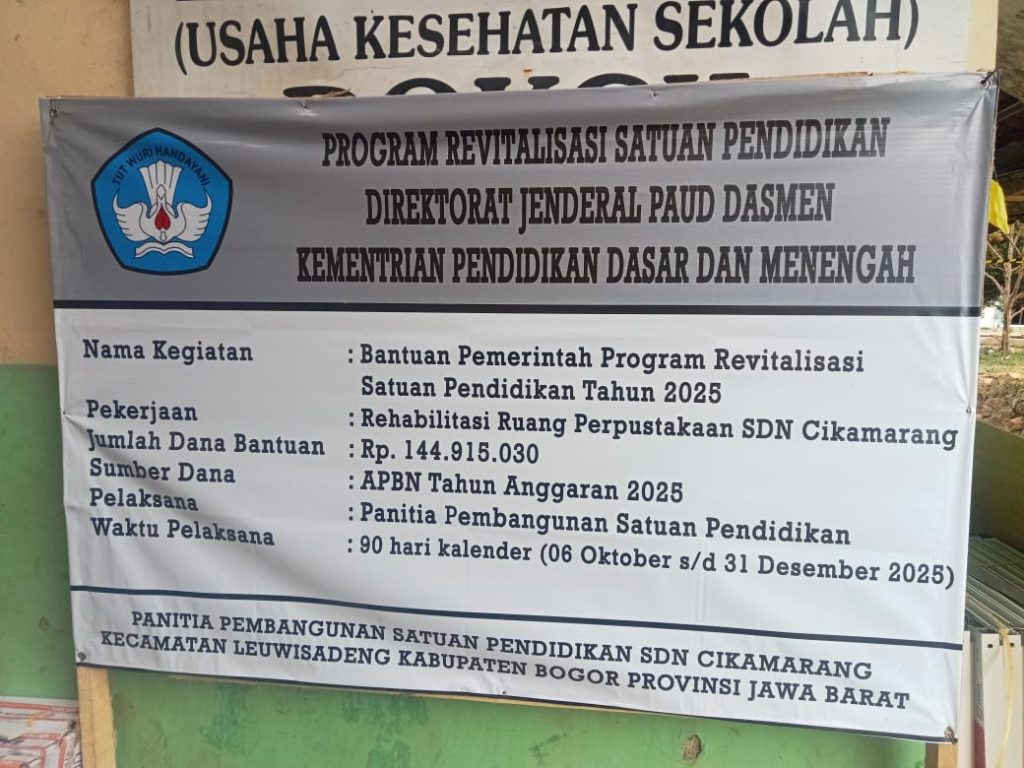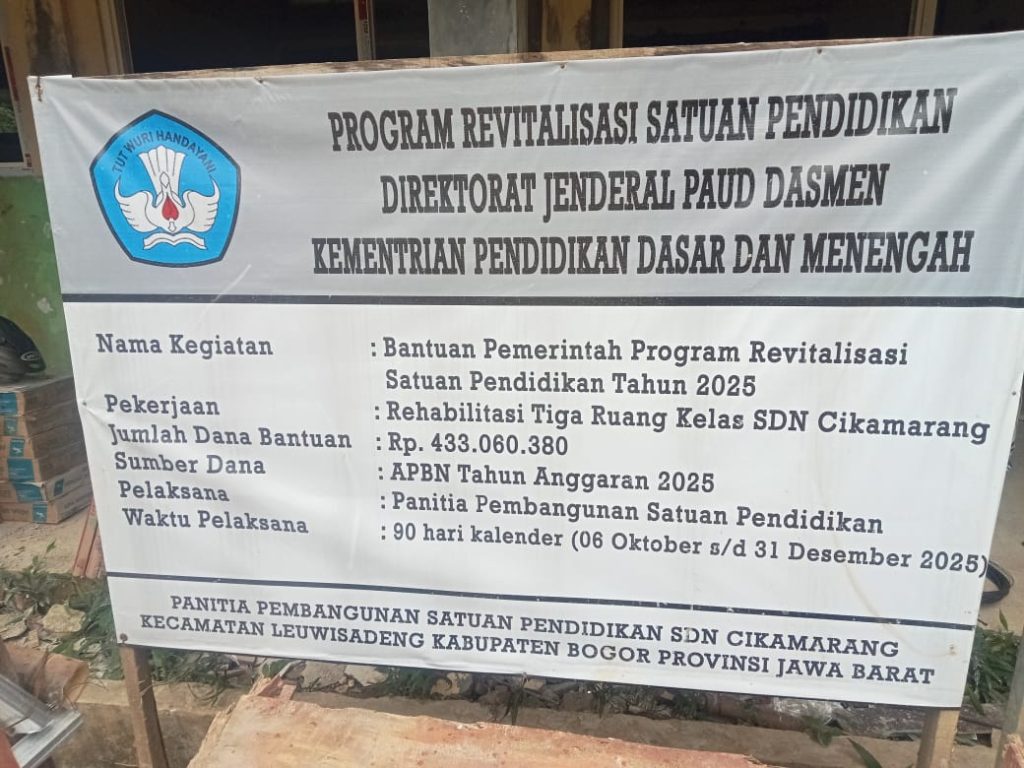 Proyek yang dilaksanakan oleh Panitia Pembangunan Satuan Pendidikan (P2SP) SDN Cikamarang, Kecamatan Leuwisadeng, Kabupaten Bogor, mencakup dua kegiatan besar, yakni rehabilitasi ruang perpustakaan dengan total anggaran Rp 144.915.030, serta rehabilitasi tiga ruang kelas dengan total dana Rp 433.060.380. Seluruh kegiatan tersebut bersumber dari Anggaran Pendapatan dan Belanja Negara (APBN) Tahun Anggaran 2025, dengan masa pelaksanaan 90 hari kalender, terhitung sejak 6 Oktober hingga 31 Desember 2025.