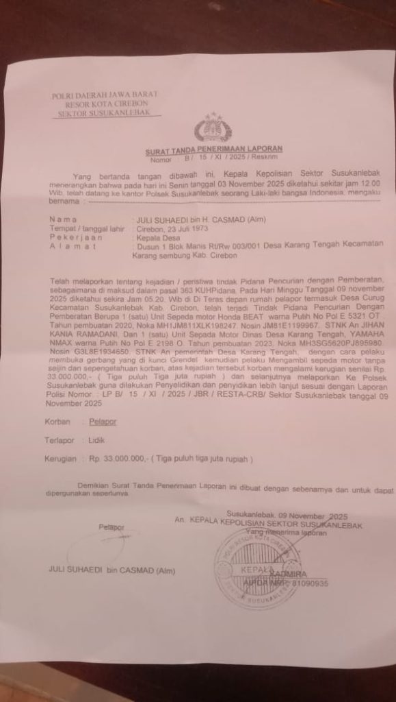 Cirebon.swaradesaku.com. Aksi kejahatan kembali terjadi di wilayah Kabupaten Cirebon. Kali ini, rumah Kuwu (Kepala Desa) Karangtengah, Kecamatan Karangsembung, Kabupaten Cirebon, menjadi sasaran kawanan pencuri. Dua unit sepeda motor, satu kendaraan dinas dan satu kendaraan pribadi, dilaporkan raib digondol maling pada Minggu (9/11/2025) dini hari sekitar pukul 03.30 WIB.
