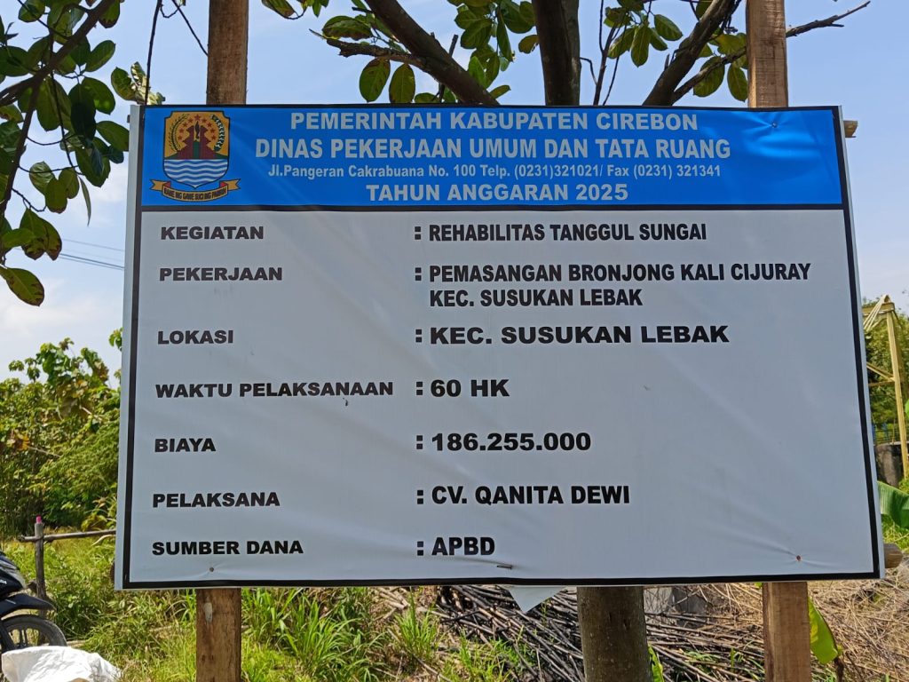 Diketahui, pekerjaanRehabilitasi Tanggul Sungai dan Pemasangan Bronjong Kali Cijuray ini menelan anggaran Rp 186.255.000,- yang bersumber dari APBD Kabupaten Cirebon Tahun 2025, dengan waktu pelaksanaan 60 hari kalender dan dikerjakan oleh CV Qanita Dewi sebagai pelaksana.