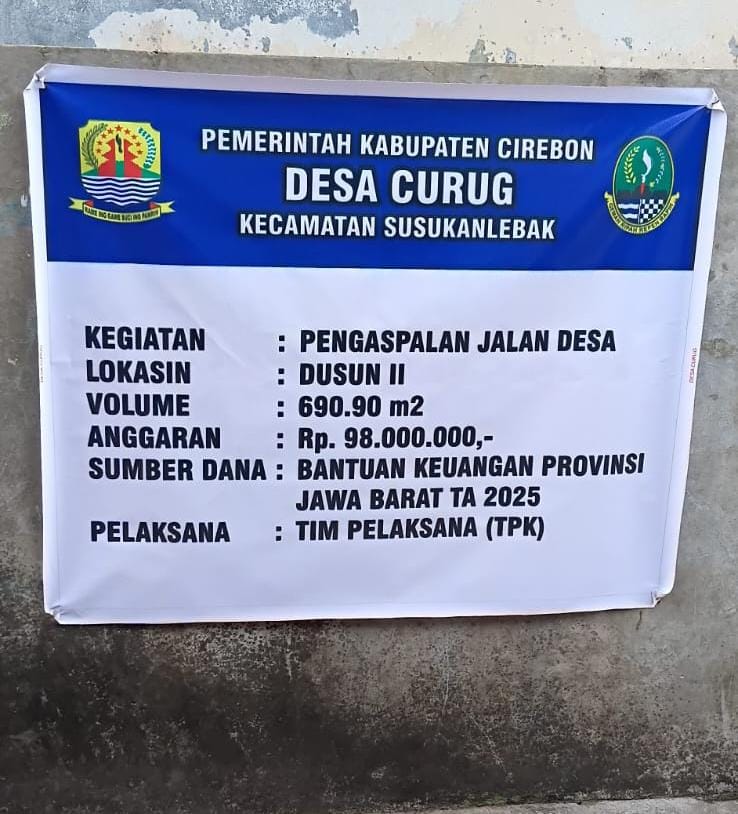 Pekerjaan pengaspalan dilakukan oleh Tim Pelaksana Kegiatan (TPK) Desa Curug dan berlokasi di Dusun 2. Proyek ini memiliki pagu anggaran sebesar Rp 98.000.000 dengan volume pekerjaan panjang 690 meter dan lebar 1,4 meter. Pembangunan akses jalan gang tersebut menjadi prioritas karena merupakan jalur yang banyak digunakan masyarakat untuk menunjang aktivitas sehari-hari.