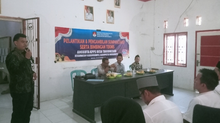 Ketua Panpilwu Desa Tanjungsari Abdullah menegaskan bahwa KPPS harus menjunjung tinggi netralitas dan siap menjalankan tugas yang telah di uraikan pada sumpah dan janji yang di bacakan oleh Panitia Pemilihan Kuwu Desa Tanjungsari.