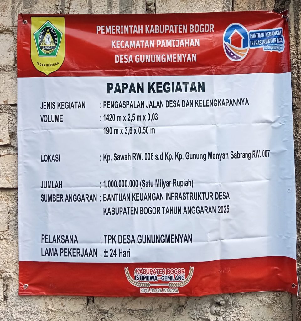 Bogor.swaradesaku.com. Pemerintah Desa (Pemdes) Gunung Menyan, Kecamatan Pamijahan, Kabupaten Bogor, telah merealisasikan program Bantuan Keuangan (Bankeu) dengan kegiatan pengaspalan Jalan Desa beserta kelengkapannya sebagai bagian dari program peningkatan infrastruktur yang setiap tahun berjalan.