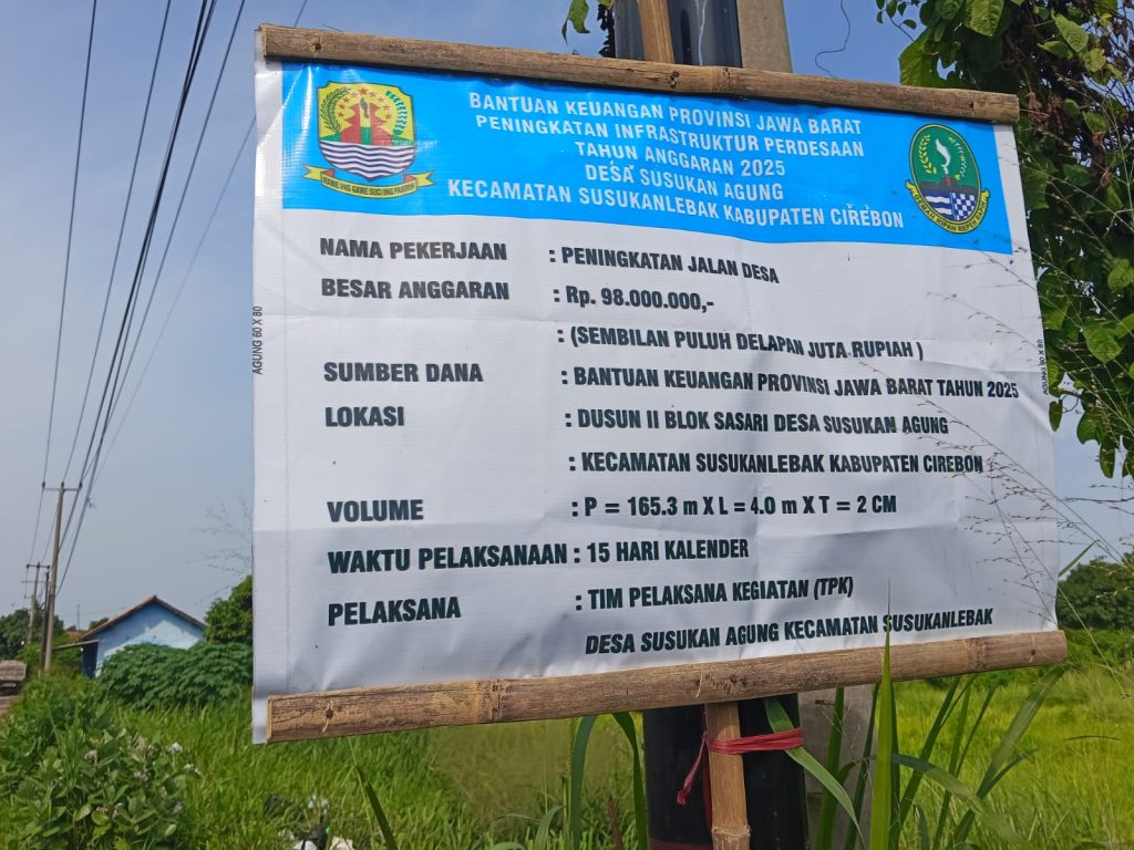 Pekerjaan peningkatan jalan tersebut dilaksanakan oleh Tim Pelaksana Kegiatan (TPK) Desa Susukan Agung dan berlokasi di Dusun 11 Blok Sasari. Proyek ini memiliki pagu anggaran sebesar Rp98.000.000, dengan volume pekerjaan sepanjang 165,3 meter, lebar 4 meter, dan ketebalan hotmix sekitar 2 sentimeter.