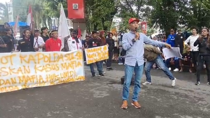 Makassar.swaradesaku.com. Pada hari Senin 15/12/25. Pukul 13.30 WIB, ratusan anggota Gabungan Mahasiswa dan Organisasi Masyarakat Ormas berkumpul di area depan Mapolda Sulawesi Selatan. Aksi yang berlangsung tenang namun penuh semangat dipimpin oleh Kuasa Hukum Ishak Hamsah dan Andi Salim Agung S.H sebagai Jenderal Lapangan Aksi dari CLA, dengan tujuan menuntut penindakan tegas terhadap pihak-pihak yang diduga terlibat mafia tanah dan penyalahgunaan wewenang di lingkungan institusi hukum di Makassar.