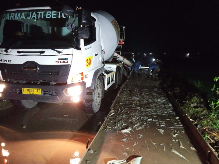 Berdasarkan hasil pantauan di lapangan serta informasi yang dihimpun dari warga sekitar, pekerjaan pengecoran rigid beton yang dilaksanakan pada Kamis malam, 25 Desember, diduga dilakukan tanpa menggunakan Lean Concrete (LC) atau lantai kerja. Beton mutu utama terlihat langsung dicor di atas tanah dasar tanpa adanya lapisan perata. Selain itu, proses pengecoran dilakukan secara bertahap dan cenderung dikerjakan pada malam hari, (25/25).