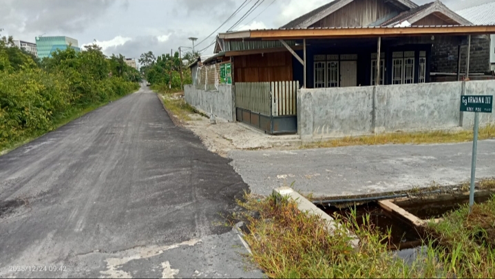 Kurang lebih 50 meteran poros jalan Arwana ini di tingkatkan badan jalan dengan pengaspalannya kondisi tanah di sekitar pemukiman warga dan juga badan jalan yang di aspalt, kondisi tanahnya dataran rendah Berawa dan gambut.