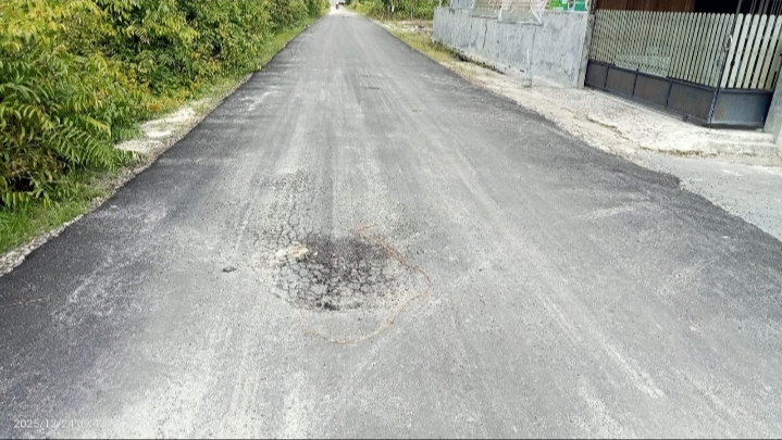 Badan jalan yang di aspalt TA.2025 ini sesuai info warga pengguna jalan di jalan poros Arwana saat ini bisa di lihat aspaltnya sudah retak – retak sementara pekerjaan pengaspalan baru selesai di kerjakan.