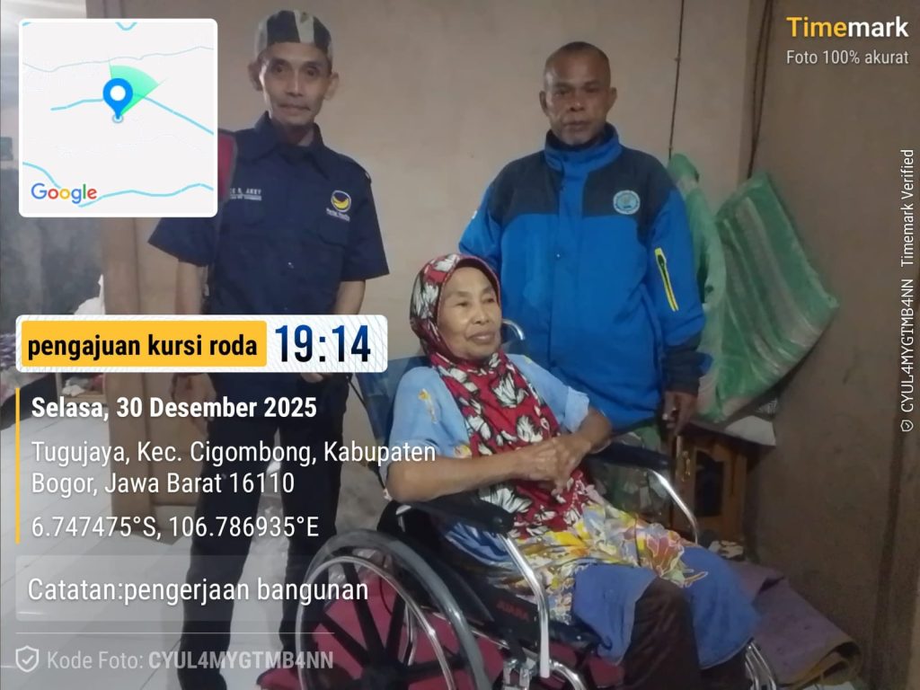 Bogor.swaradesaku.com. Dewan Pimpinan Cabang (DPC) Partai Nasional Demokrat (NasDem) Kecamatan Cigombong menyerahkan bantuan berupa kursi roda kepada Ibu Icah, warga Kampung Sukamanah RT 001/010, Desa Tugujaya, Kecamatan Cigombong, Kabupaten Bogor.