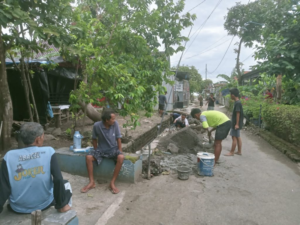 Indramayu.swaradesaku.com. Warga Gg. Disel Blok Jawet RT 07/01 Desa Juntinyuat Kecamatan Juntinyuat Kabupaten Indramayu Provinsi Jawa Barat, Justru harus memikul beban pembangunan infrastruktur secara mandiri, Warga membangun senderan lingkungan mereka yang sudah lama tidak disentuh oleh Pemerintah Desa.(11/1/26).
