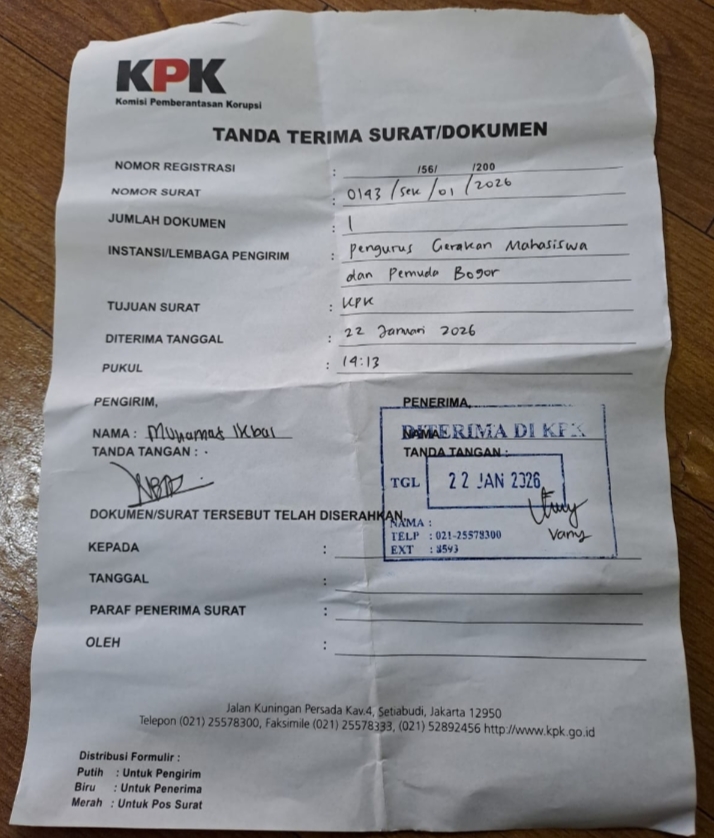 Bogor.swaradesaku.com. Gerakan Mahasiswa dan Pemuda Bogor (GMPB) secara resmi melaporkan salah satu pejabat di lingkungan Pemerintah Kabupaten Bogor ke Komisi Pemberantasan Korupsi (KPK) atas dugaan keterlibatan dalam tindak pidana korupsi. Laporan tersebut merupakan bentuk komitmen GMPB dalam mengawal transparansi dan akuntabilitas pengelolaan keuangan negara, khususnya di wilayah Kabupaten Bogor.(22/01/26)