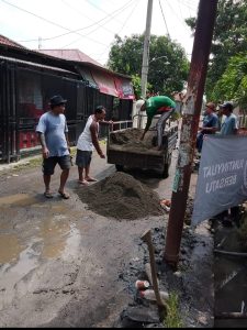 Masyarakat Desa Juntinyuat Kecamatan Juntinyuat melakukan perbaikan jalan rusak secara swadaya. Peran Pemdes Juntinyuat terkait hal ini pun dipertanyakan.