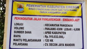 Salah satu proyek yang tengah dikerjakan adalah peningkatan Jalan Pengarengan–Sindanglaut. Pekerjaan tersebut dilaksanakan oleh CV. Decon Jaya Mandiri dengan sumber anggaran dari APBD Kabupaten Cirebon tahun 2026 senilai Rp 910.832.000.