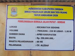 Cirebon.swaradesaku.com. Proyek pemeliharaan berkala Jalan Putat–Koreak di Kecamatan Sedong, Kabupaten Cirebon, menuai sorotan publik. Proyek yang bersumber dari APBD Kabupaten Cirebon Tahun Anggaran 2026 dengan nilai mencapai Rp 290 juta itu diduga tidak sesuai dengan spesifikasi teknis (spek) maupun Rencana Anggaran Biaya (RAB).