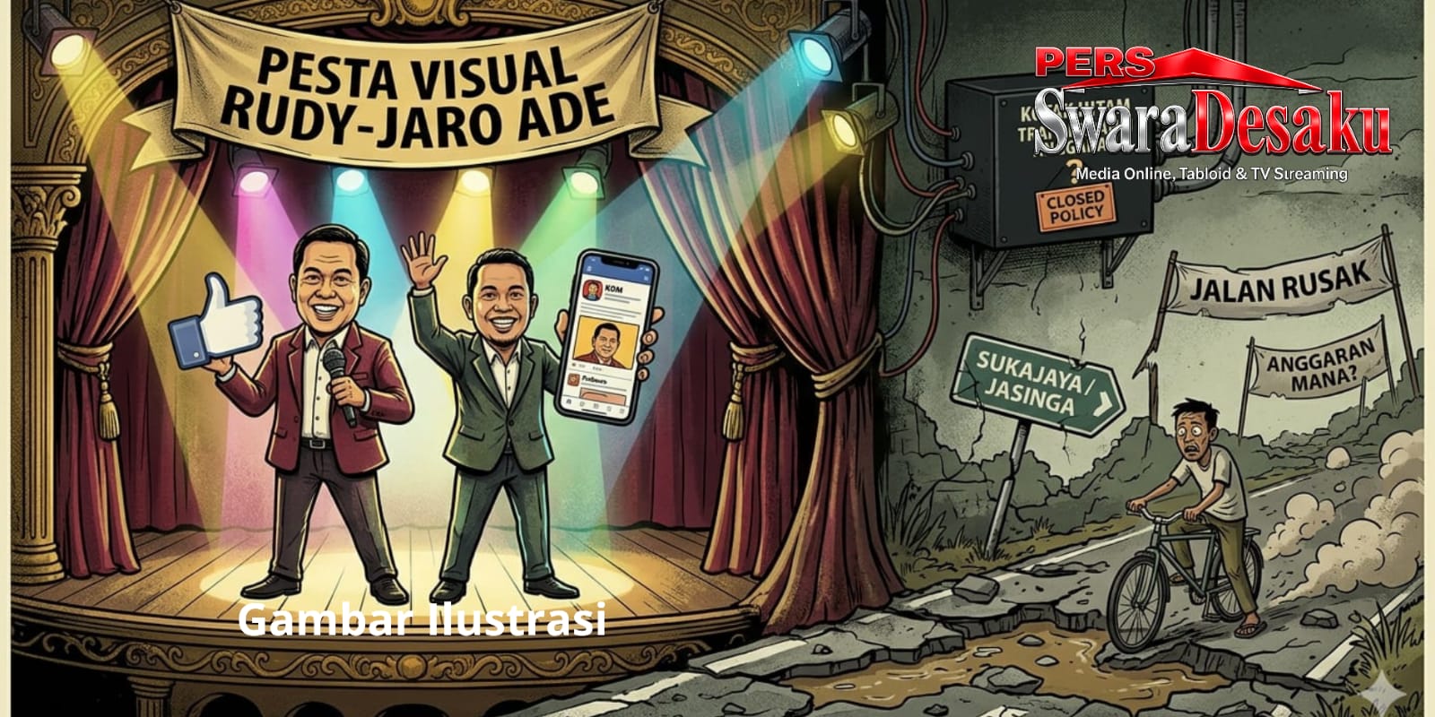 Kabupaten Bogor kini seolah menjadi panggung sandiwara politik yang megah. Di bawah kendali Rudy Susmanto dan Ade Ruhandi (Jaro Ade), publik disuguhi parade konten dan narasi simbolis yang rapi. Namun, di balik bingkai kamera yang estetik, ada jeritan transparansi yang tersumbat dan debu jalanan rusak yang kian menyesakkan.