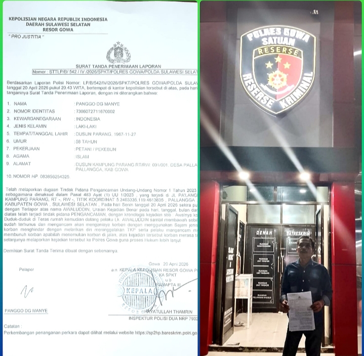Laporan tersebut tercatat dengan Nomor: LP/B/542/IV/2026/SPKT/Polres Gowa/Polda Sulawesi Selatan, yang diterima pada Senin, 20 April 2026, pukul 20.43 WITA di Kantor Polres Gowa.