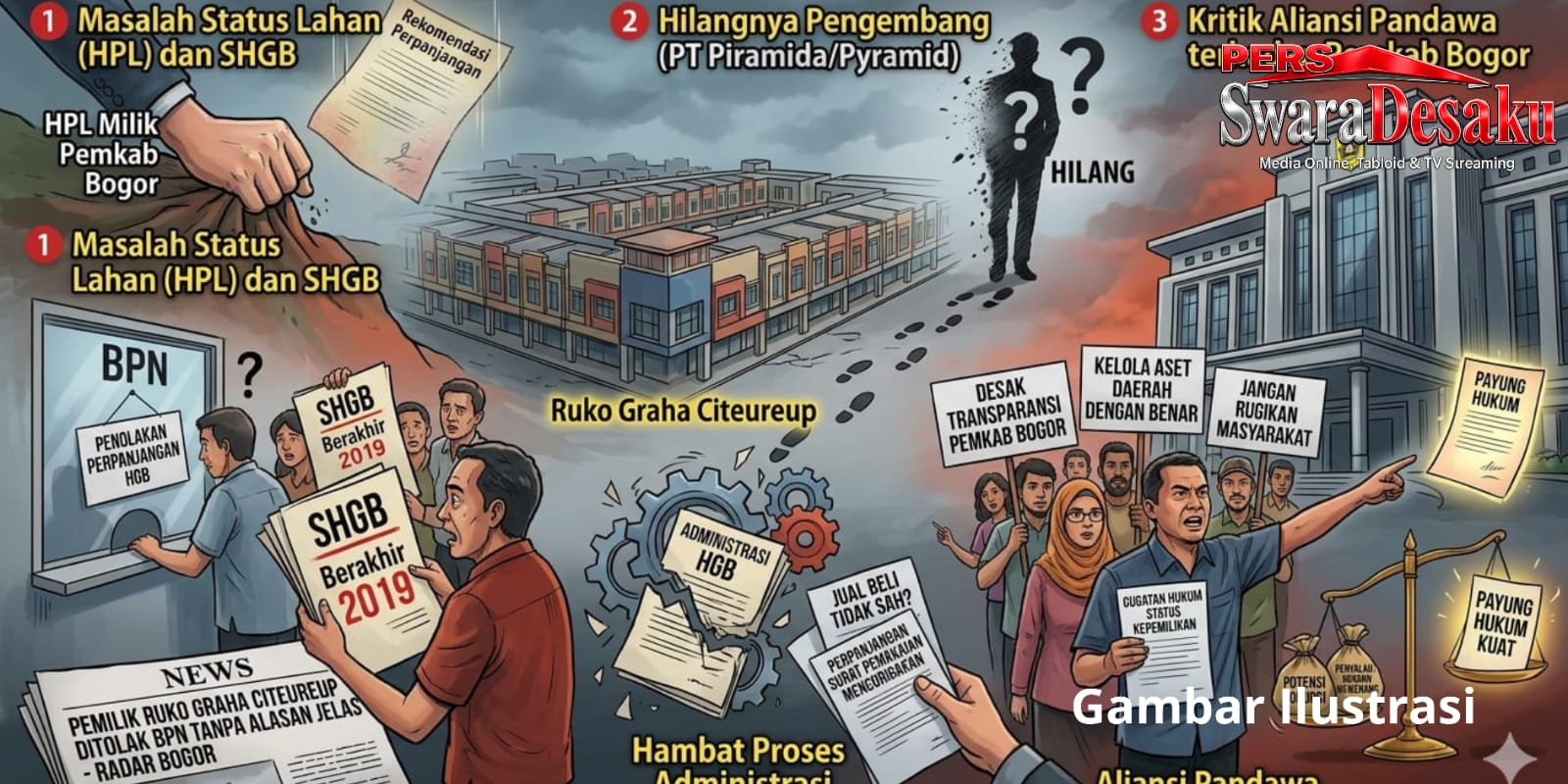 Bogor.swaradesaku.com. Kasus pengelolaan aset Ruko Graha Citeureup yang disoroti oleh Aliansi Pandawa mencerminkan polemik panjang terkait ketidakjelasan administrasi antara Pemerintah Kabupaten (Pemkab) Bogor, pengembang, dan para pemilik ruko.